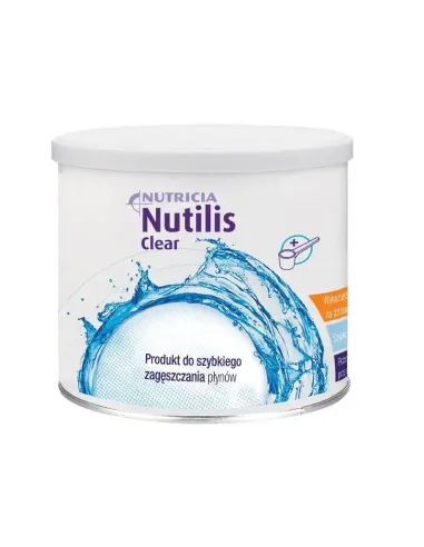 Nutilis Clear to preparat zagęszczający w formie proszku, przeznaczony do zagęszczania posiłków. Nutilis Clear zawiera gumę ksantanową, gumę guar oraz maltodekstryny. Jego zaletą jest oporność na amylazę ślinową, dzięki czemu zachowuje oczekiwany stopień zagęszczenia czy pokarmu podczas spożywania. Nutilis Clear szybko i skutecznie zagęszcza napoje oraz pokarmy nie zmieniając ich koloru, zapachu i smaku. Nutilis Clear nie dostarcza żadnych dodatkowych składników odżywczych oraz kalorii. Puszka Nutilis Clear zawiera 175 g proszku.