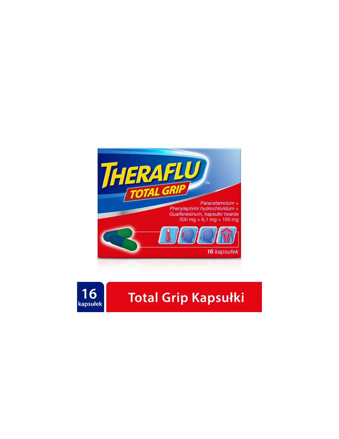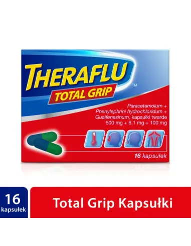 lek jest wskazany do krótkotrwałego leczenia objawów przeziębienia, dreszczy oraz grypy. Objawy te obejmują łagodne i umiarkowane bóle, gorączkę, uczucie zatkanego nosa (zablokowany nos) oraz mokry kaszel. Lek Theraflu Total Grip jest wskazany do stosowania tylko u osób dorosłych, osób w podeszłym wieku oraz u młodzieży w wieku 16 lat i starszej.