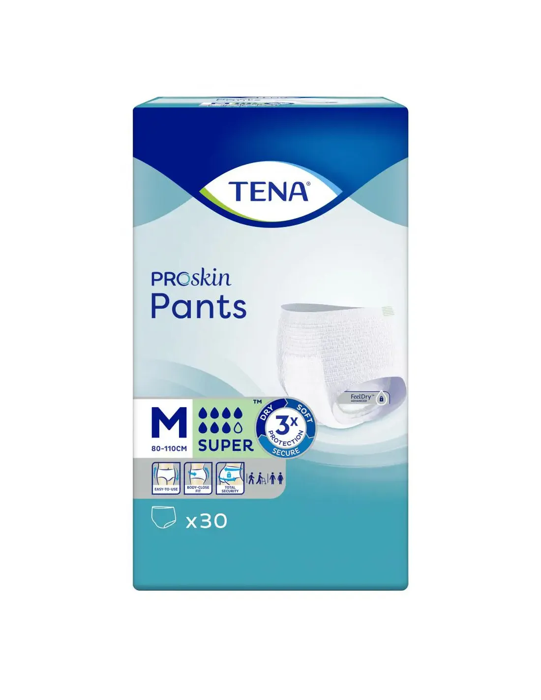 Majtki chłonne TENA Pants Super M to produkty chłonne zalecane do codziennego stosowania w średnim i ciężkim nietrzymaniu moczu (poziom chłonności 7/8). TENA Pants Super M przeznaczone są dla osób chodzących, poruszających się choćby po domu, o rozmiarze 80-110 cm w pasie. TENA Pants dzięki systemom Feel Dry i Odour Neutralizer zapewniają suchość i neutralizują nieprzyjemny zapach. TENA Pants są zakładane jak zwykła bielizna, zapewniają wysoki komfort i dyskrecję. Majtki chłonne TENA dobrze przylegają do ciała, dzięki czemu nie odznaczają się pod ubraniem. Dostępne są w różnych rozmiarach i poziomach chłonności, również w refundacji.