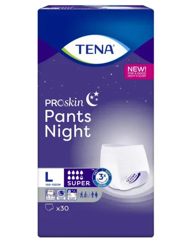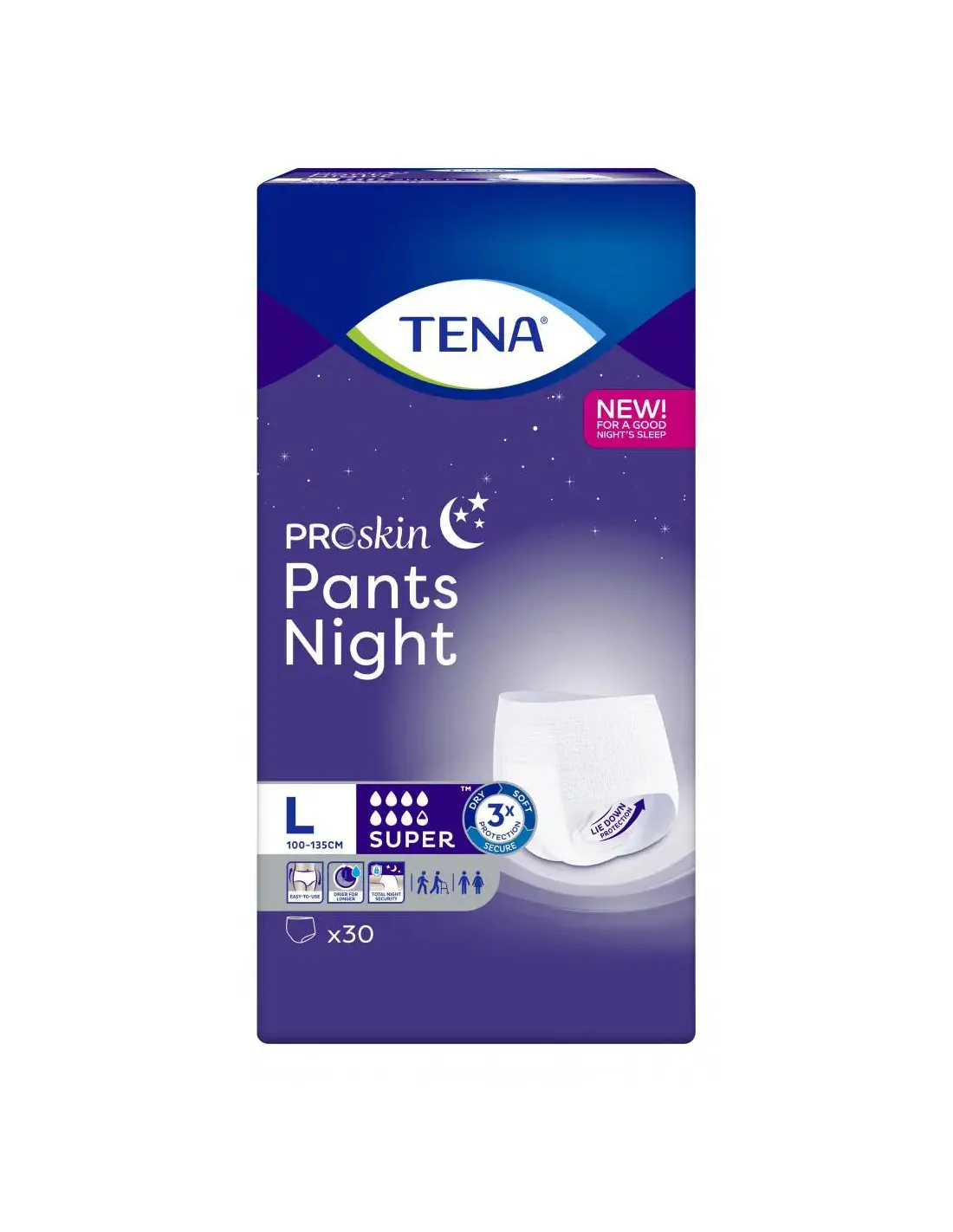 Majtki chłonne TENA Pants ProSkin Super Night to produkty chłonne zalecane do codziennego stosowania na noc w średnim i ciężkim nietrzymaniu moczu (poziom chłonności 7,5/8).Zaprojektowane z myślą o potrzebach osób z NTM w nocy. Dzięki nowym rozwiązaniom, chłonność w tylnej części wkładu została zwiększona, przez co skóra jest bardziej sucha i lepiej chroniona podczas snu. Zkładane jak zwykła bielizna TENA Pants ProSkin Super Night przeznaczone są dla osób chodzących, poruszających się choćby po domu. Produkty TENA Pants ProSkin Super Night zapewniają Potrójną Ochornę przed przeciekaniem, długotrwałą suchość i miękkość, wspierając zdrowie skóry. System Lie Down Protection użyty w ich produkcji zapewnia lepszą ochronę przed przeciekaniem nocą. Specjalne, w pełni oddychające materiały, z których wykonany jest produkt, zapewniają komfort i wspierają zdrowie skóry. Produkty TENA Pants ProSkin Super Night zostały przebadane i otrzymały akredytację Skin Health Alliance - wiodącej, niezależnej instutycji zrzeszającej ekspertów zajmujących się zdrowiem skóry. Otrzymanie akredytacji Skin Health Alliance wymaga spełnienia szeregu rygorystycznych wymagań dotyczących wpływu produktu na zdrowie skóry. Akredytacja Skin Health Alliance daje pewność, że produkty TENA Pants ProSkin są przyjazne dla skóry. Produkty TENA Pants ProSkin Super Night dostępne są w różnych rozmiarach i poziomach chłonności, również w refundacji.