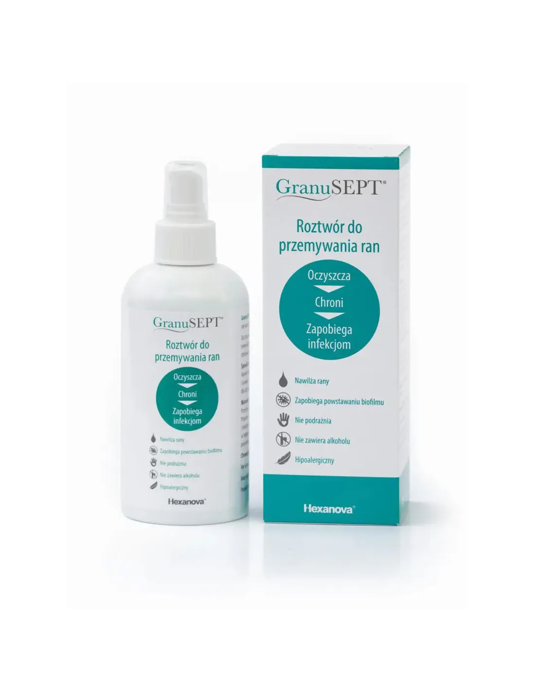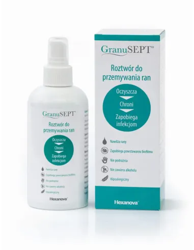 GranuSEPT® roztwór może być stosowany do nawilżenia opatrunku rany jak i samej rany, a także do rozmiękczenia zaschniętego opatrunku. Wypłukuje substancje drażniące odpowiadające za nieprzyjemny zapach z rany.