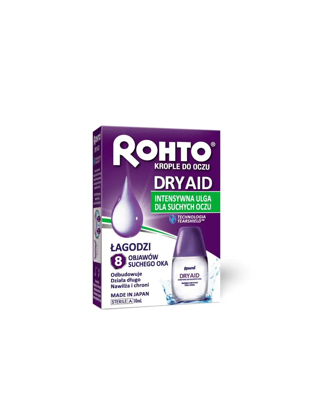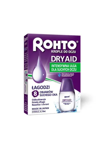 Rohto® Dry Aid® przynosi ulgę i chroni przed objawami zespołu suchego oka na długi czas. Rohto® Dry Aid® jest przezroczystym płynem, którego zastosowanie przynosi uczucie odświeżenia i ulgę od objawów zespołu suchego oka takich jak uczucie suchości oka, ból, swędzenie, pieczenie, kłucie, uczucie piasku w oku, uczucie zmęczenia i podrażnienie oka.