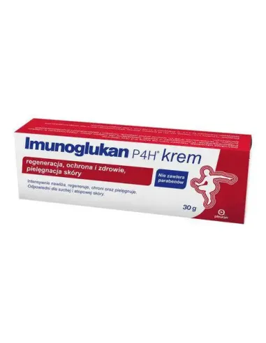 - Krem Imunoglukan P4H® intensywnie nawilża, regeneruje, chroni oraz pielęgnuje skórę. Preparat w postaci kremu jest emulsją typy olej w wodzie, która dzięki swojemu działaniu, utrzymuje zdrową, gładką, nawilżona skórę oraz wspomaga jej naturalną odnowę.