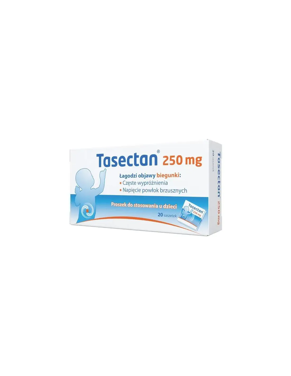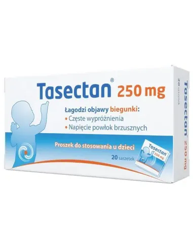 Tasectan jest stosowany w celu przywrócenia fizjologicznych funkcji ścian jelita. Wyrób medyczny w postaci proszku w saszetkach dla dzieci. Tianiny żelatyny, składnik produktu, nie ulega przemianie w żółądku mi działa poprzez tworzenie warstwy chroniącej błonę śluzową jelita, zmniejszając częstostliwość i czass trwania biegunki.