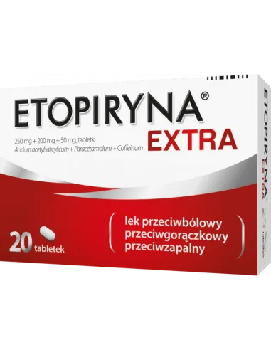 Etopiryna Extra to lek wieloskładnikowy dostępny w opakowaniu zawierającym 20 tabletek. Każda tabletka zawiera 250 mg kwasu acetylosalicylowego, 200 mg paracetamolu oraz 50 mg kofeiny. Połączenie tych substancji zapewnia działanie przeciwbólowe, przeciwzapalne i przeciwgorączkowe. Lek jest zalecany w leczeniu bólów głowy, zwłaszcza migrenowych, oraz innych bólów o umiarkowanym nasileniu, szczególnie pochodzenia zapalnego. Przeznaczony dla osób powyżej 16. roku życia. Zalecana dawka to 1-2 tabletki przyjmowane 3 razy na dobę, nie przekraczając 6 tabletek dziennie. Lek należy stosować po posiłku, popijając obficie wodą. Przed użyciem należy zapoznać się z przeciwwskazaniami i możliwymi działaniami niepożądanymi.