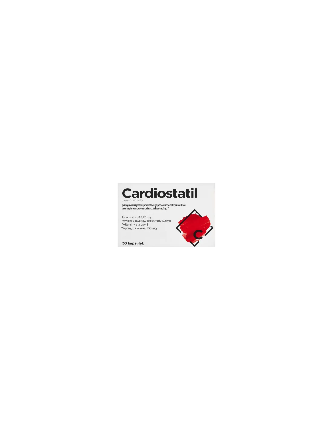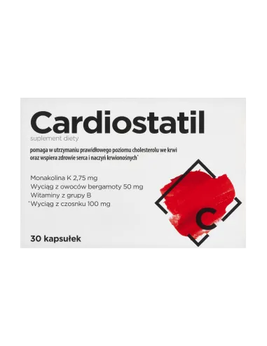 Cardiostatil to suplement diety w formie kapsułek, zawierający monakolinę K z fermentowanego czerwonego ryżu, wyciąg z owoców bergamoty, wyciąg z czosnku oraz witaminy B6 i B12. Preparat wspomaga utrzymanie prawidłowego poziomu cholesterolu we krwi oraz wspiera zdrowie serca i naczyń krwionośnych.