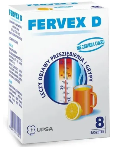 Fervex D jest lekiem złożonym. Paracetamol działa przeciwbólowo i przeciwgorączkowo. Maleinian feniraminy zmniejsza przekrwienie i obrzęk błon śluzowych, przez co udrażnia przewody nosowe, hamuje odruch kichania i łzawienie oczu. Kwas askorbowy uzupełnia niedobory witaminy C w organizmie. Lek wskazany do stosowania powyżej 15 roku życia. Nie zawiera cukru.