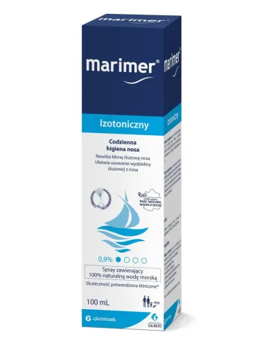 Marimer izotoniczny to spray do nosa zawierający 100% naturalna wodę morską, pozyskiwaną z terenu Morskiego Parku Przyrody Iroise, bogatą w sole mineralne i pochodzące z morza oligoelementy. Marimer izotoniczny można stosować codziennie dzięki fizjologicznemu stężeniu (stężenie izotoniczne - 0,9%). System mikrodyfuzji umożliwia delikatne i równomierne rozpylenie wody morskiej na błonę śluzową nosa. Końcówka aplikatora zapewnia łatwe i bezpieczne stosowanie. Zawór jednokierunkowy został zaprojektowany tak, aby uniknąć ryzyka zanieczyszczenia czynnikami zewnętrznymi i zapewnić ochronę roztworu.