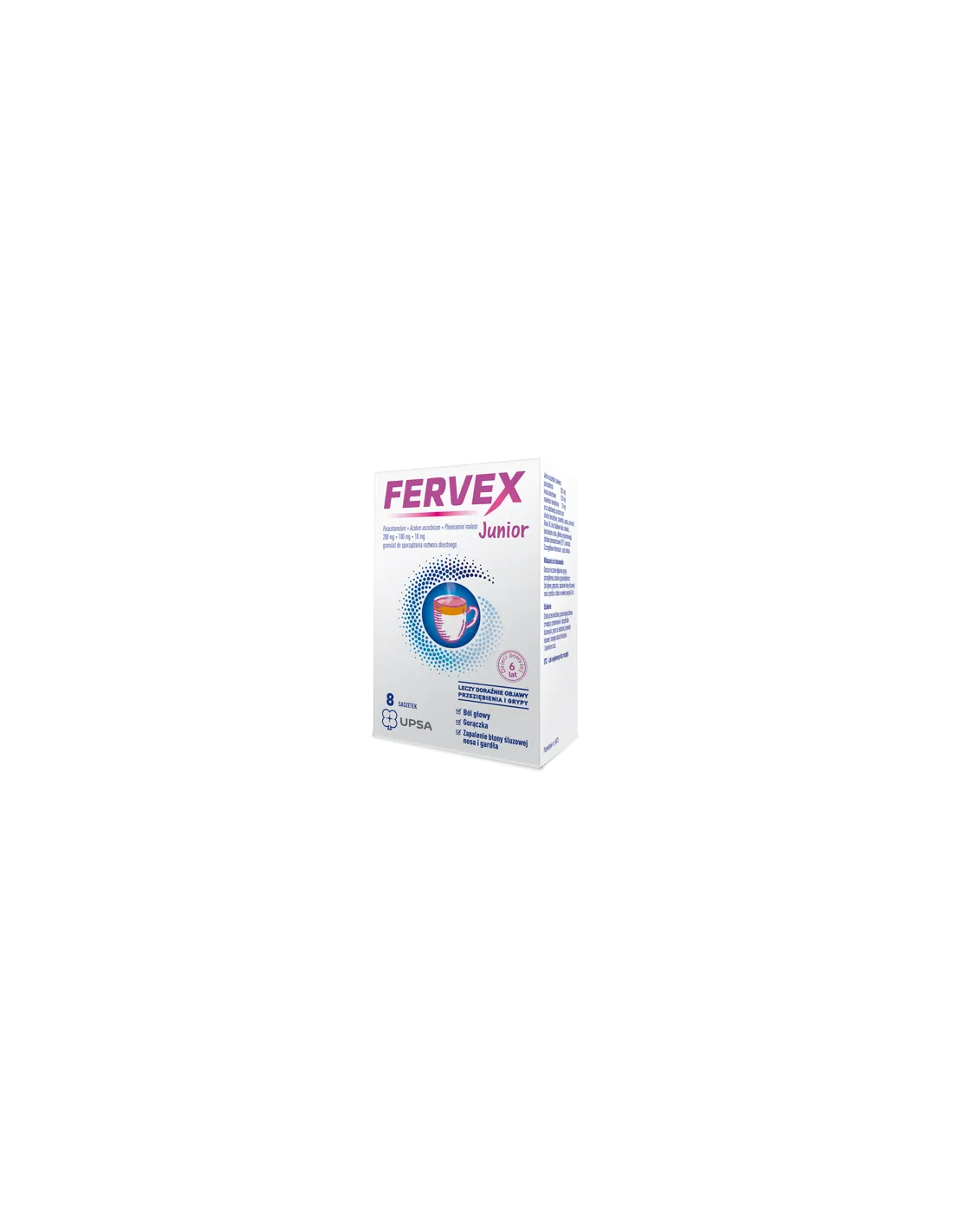 Fervex Junior jest lekiem złożonym. Paracetamol działa przeciwbólowo i przeciwgorączkowo. Maleinian feniraminy zmniejsza przekrwienie i obrzęk błon śluzowych, przez co udrażnia przewody nosowe, hamuje odruch kichania i łzawienie oczu. Kwas askorbowy uzupełnia niedobory witaminy C w organizmie. Nie zawiera cukru. Lek wskazany do stosowania powyżej 6 roku życia.