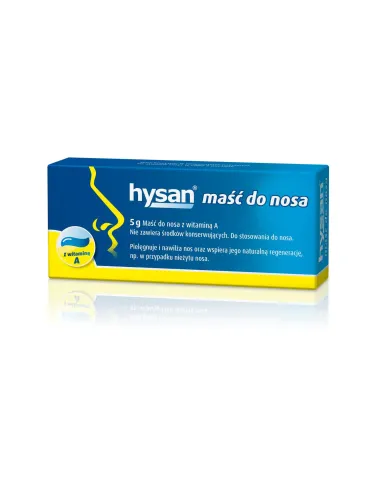 hysan® jest maścią do nosa zwierającą witaminę A, która oprócz palmitynianu retinolu (witaminy A) zawiera płynną parafinę o wysokiej gęstości i niskiej gęstości, lanolinę i białą wazelinę.