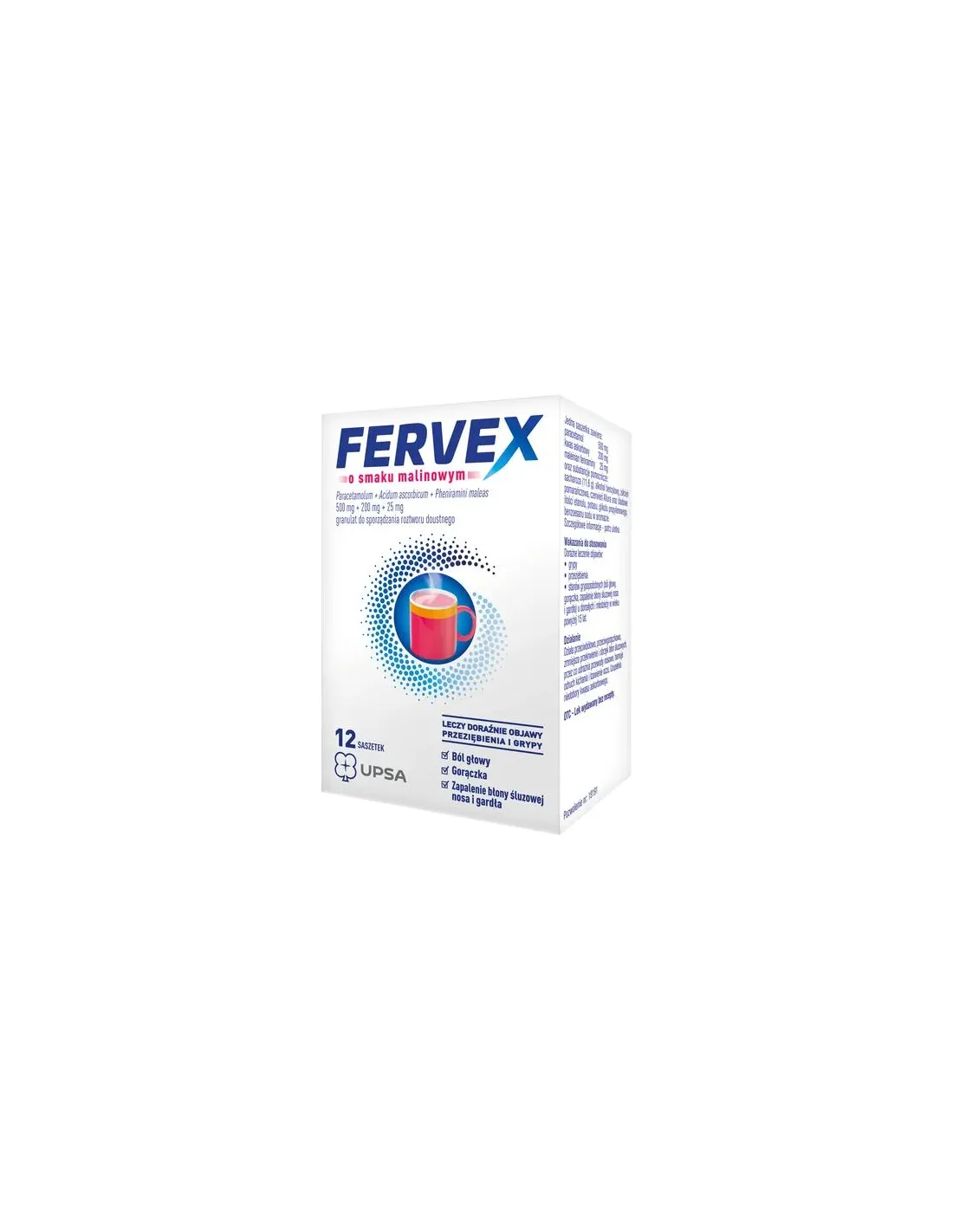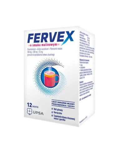Fervex o smaku malinowym jest lekiem złożonym. Paracetamol działa przeciwbólowo i przeciwgorączkowo. Maleinian feniraminy zmniejsza przekrwienie i obrzęk błon śluzowych, przez co udrażnia przewody nosowe, hamuje odruch kichania i łzawienie oczu. Kwas askorbowy uzupełnia niedobory witaminy C w organizmie. Lek wskazany do stosowania powyżej 15 roku życia.