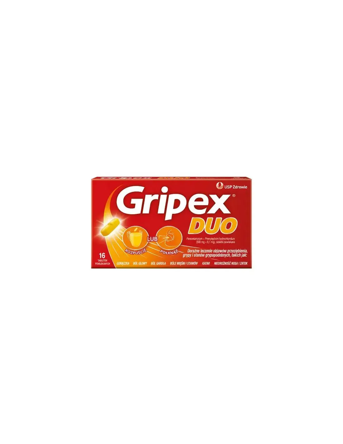 Gripex Duo jest lekiem złożonym, który zawiera dwie substancje czynne: paracetamol i fenylefrynę. Lek Gripex Duo ma postać tabletek powlekanych (opakowanie zawiera 16 tabletek). Jest odpowiedni dla osób dorosłych oraz dzieci powyżej 12. roku życia. Preparat jest przeznaczony do doraźnego stosowania.