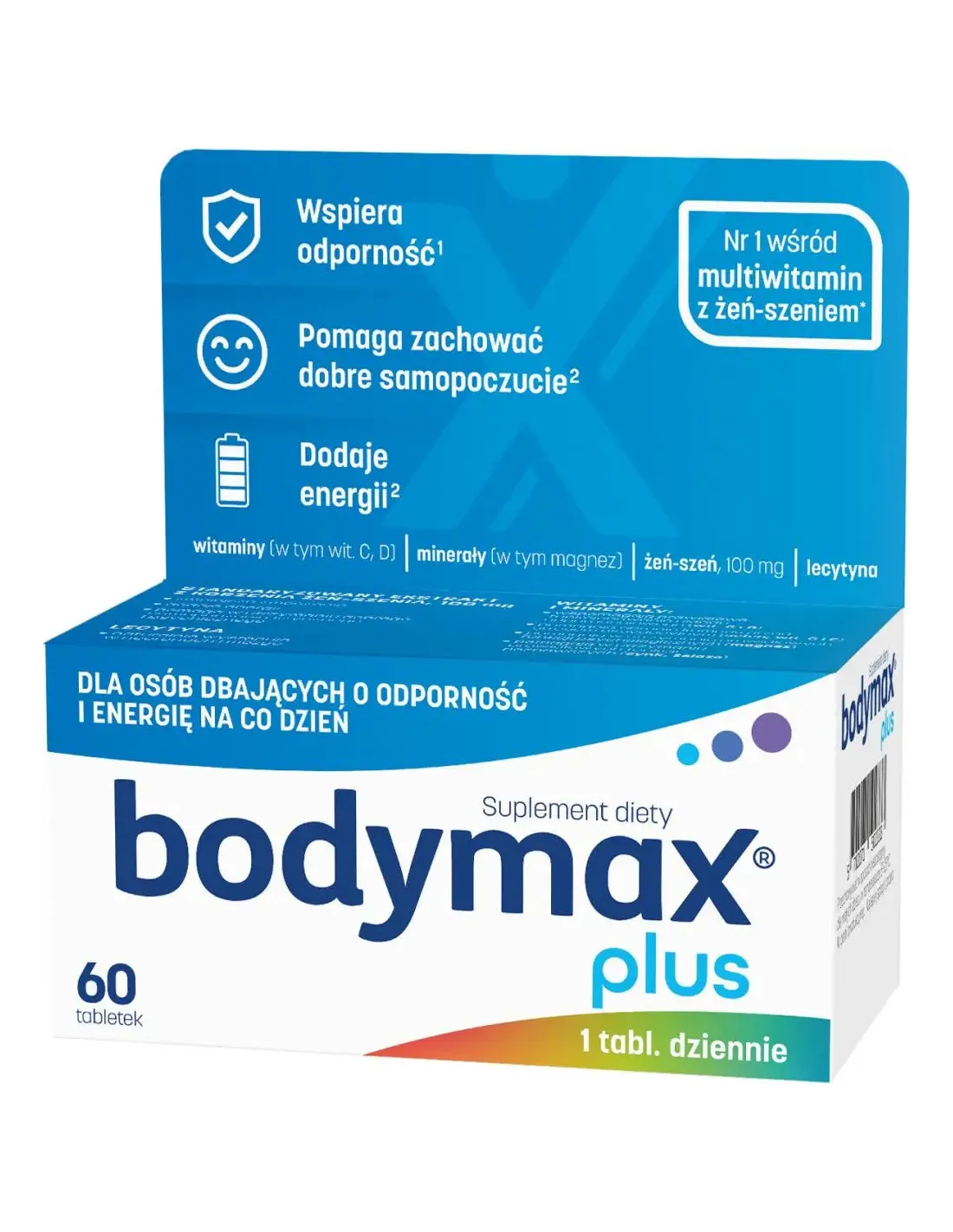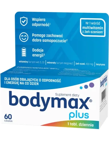 Bodymax Plus to suplement diety łączący standaryzowany ekstrakt z korzenia żeń-szenia z kompleksem 12 witamin, 6 minerałów oraz lecytyną. Żeń-szeń, znany jako "korzeń życia", pomaga zmniejszyć uczucie zmęczenia, wspiera sprawność fizyczną i umysłową oraz naturalne siły obronne organizmu. Lecytyna wspomaga funkcje układu nerwowego, poprawiając pamięć i koncentrację. Witaminy z grupy B (B6, B12, niacyna) oraz magnez przyczyniają się do zmniejszenia uczucia zmęczenia i znużenia, wspierając prawidłowy metabolizm energetyczny. Witaminy C i E oraz selen działają jako przeciwutleniacze, chroniąc komórki przed stresem oksydacyjnym. Witaminy A, D, C, a także miedź, selen i cynk wspierają funkcjonowanie układu odpornościowego.