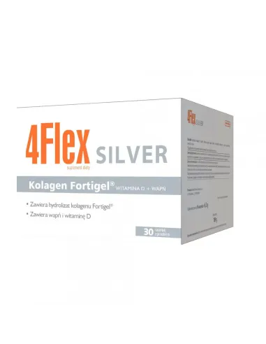 4 Flex Silver to suplement diety, który zawiera hydrolizat kolagenu Fortigel, wapń i witaminę D. Białko pomaga utrzymać zdrowe kości, wspiera wzrost i utrzymanie masy mięśniowej. Wapń jest potrzebny do utrzymania zdrowych kości oraz pomaga w prawidłowym funkcjonowaniu mięśni. Witamina D bierze udział w prawidłowym wchłanianiu wapnia, pomaga w utrzymaniu prawidłowego poziomu wapnia we krwi, pomaga w utrzymaniu zdrowych kości oraz pomaga w prawidłowym funkcjonowaniu mięśni.