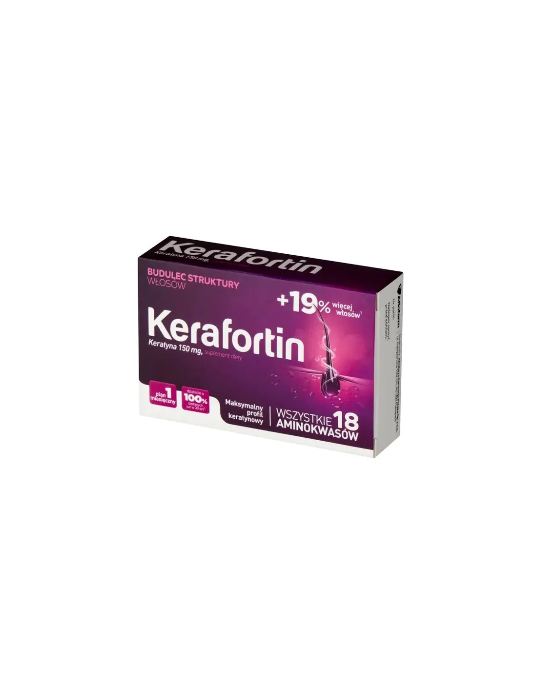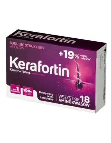 Kerafortin to suplement diety opracowany z myślą o wsparciu kondycji włosów, skóry i paznokci. Unikalność preparatu opiera się na zawartości Cynatine® HNS – opatentowanej, rozpuszczalnej keratyny, która jest lepiej przyswajalna przez organizm niż tradycyjne formy tego białka. Skład produktu został uzupełniony o kluczowe witaminy i minerały, które wspomagają syntezę białek strukturalnych i chronią komórki przed czynnikami zewnętrznymi.