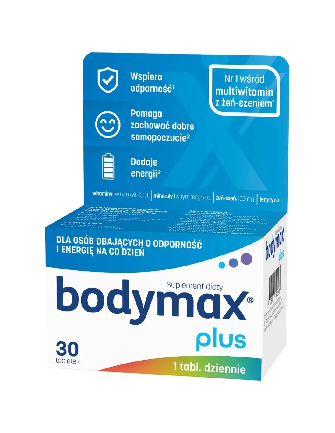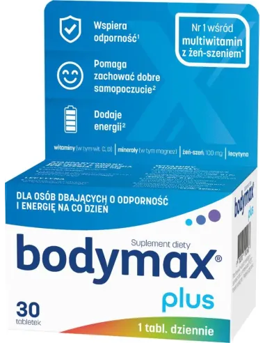 Bodymax Plus to suplement diety łączący standaryzowany ekstrakt z korzenia żeń-szenia z kompleksem 12 witamin, 6 minerałów oraz lecytyną. Żeń-szeń, znany jako "korzeń życia", pomaga zmniejszyć uczucie zmęczenia, wspiera sprawność fizyczną i umysłową oraz naturalne siły obronne organizmu. Lecytyna wspomaga funkcje układu nerwowego, poprawiając pamięć i koncentrację. Witaminy z grupy B (B6, B12, niacyna) oraz magnez przyczyniają się do zmniejszenia uczucia zmęczenia i znużenia, wspierając prawidłowy metabolizm energetyczny. Witaminy C i E oraz selen działają jako przeciwutleniacze, chroniąc komórki przed stresem oksydacyjnym. Witaminy A, D, C, a także miedź, selen i cynk wspierają funkcjonowanie układu odpornościowego.