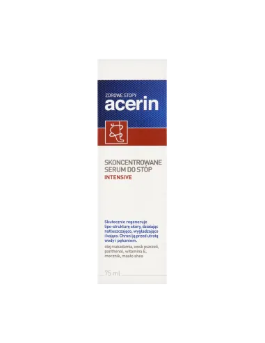 Acerin Intensive regeneruje i odżywia skórę stóp, pozostawiając ją nawilżoną oraz wygładzoną. Olej makadamia skutecznie łagodzi i zapobiega podrażnieniom, widocznie poprawiając kondycję naskórka. Wosk pszczeli zapobiega przesuszaniu, dzięki czemu stopy pozostają miękkie i przyjemne w dotyku. Dodatek masła shea i witaminy E odmładza i nawilża skórę, a pantenol przyspiesza jej regenerację.