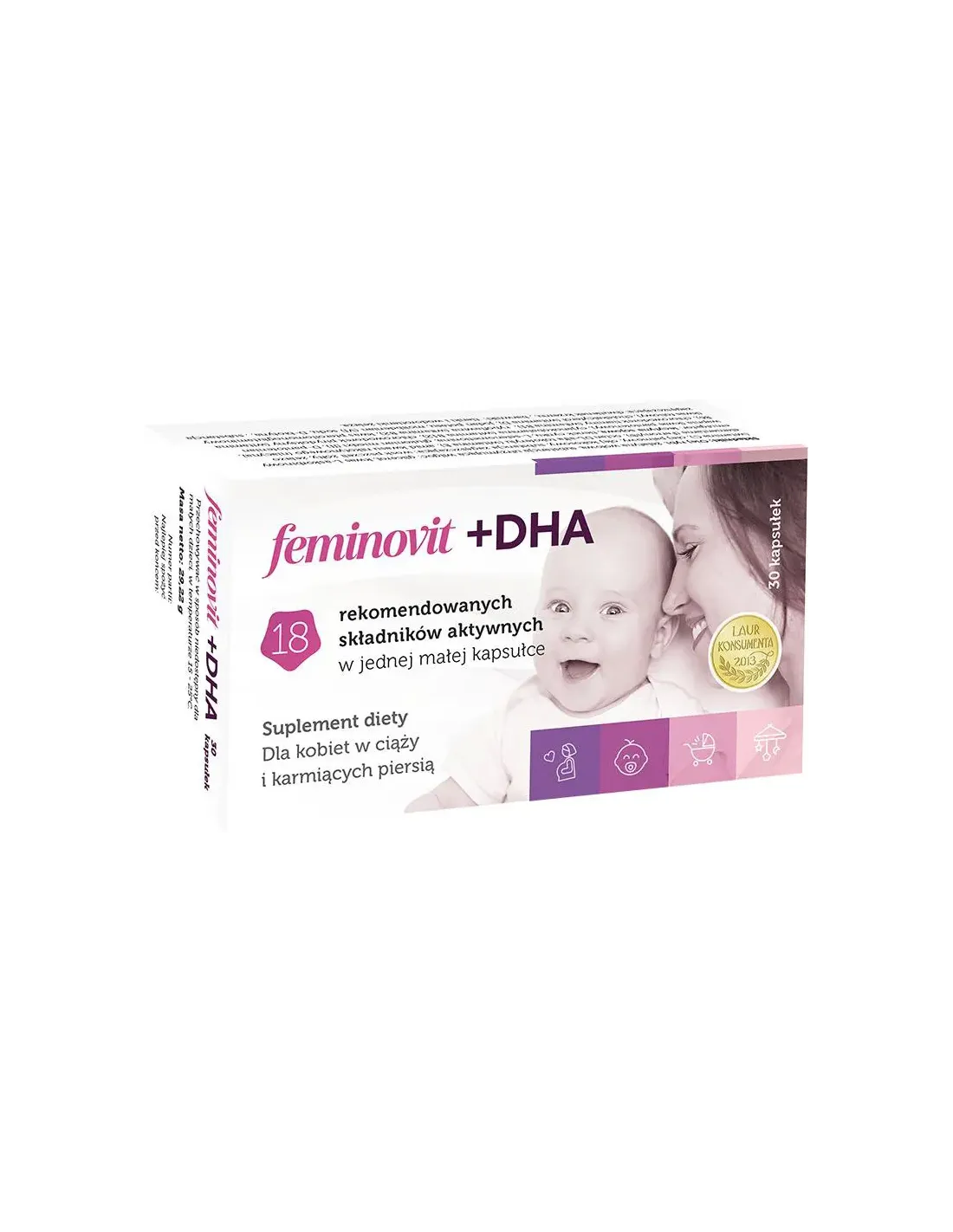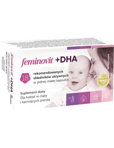 Składniki suplementu diety Feminovit + DHA pełnią ważną rolę w funkcjonowaniu w organizmu kobiet w ciąży oraz przyszłych mam, wpływając na prawidłowy przebieg ciąży.