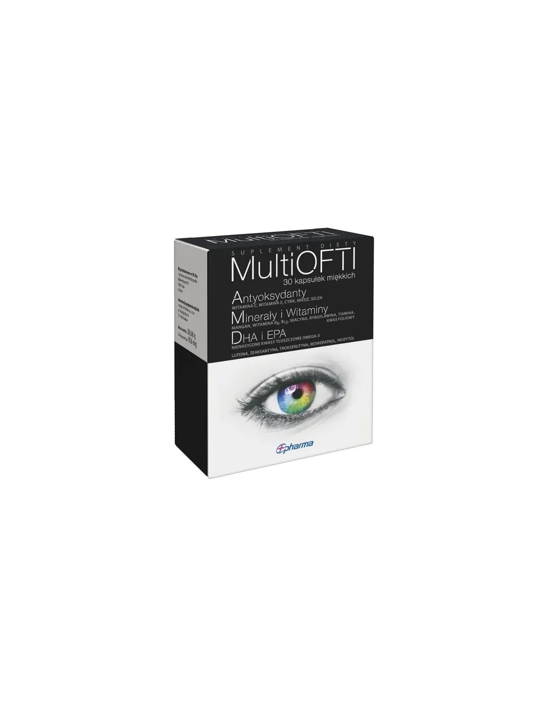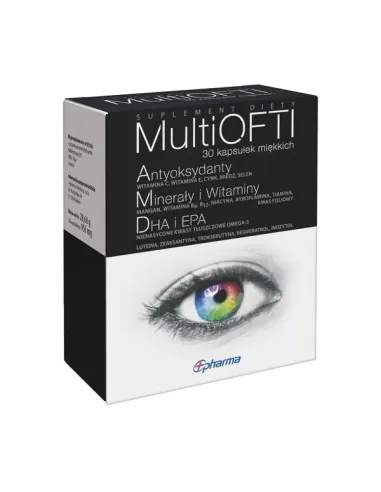 MultiOFTI to suplement diety w formie miękkich kapsułek, zaprojektowany w celu wsparcia prawidłowego widzenia i ochrony oczu przed stresem oksydacyjnym. Zawiera kompozycję składników, takich jak kwasy omega‑3, luteina, zeaksantyna oraz zestaw witamin i minerałów.