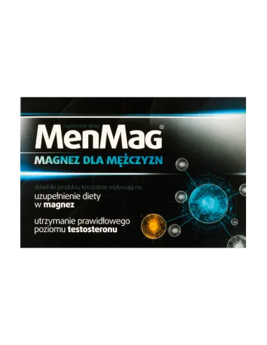 MenMag to suplement diety stworzony specjalnie dla mężczyzn, zawierający magnez, witaminę B6, cynk oraz wyciąg z korzenia maca. Preparat wspomaga prawidłowe funkcjonowanie mięśni, układu nerwowego oraz pomaga utrzymać odpowiedni poziom testosteronu we krwi.