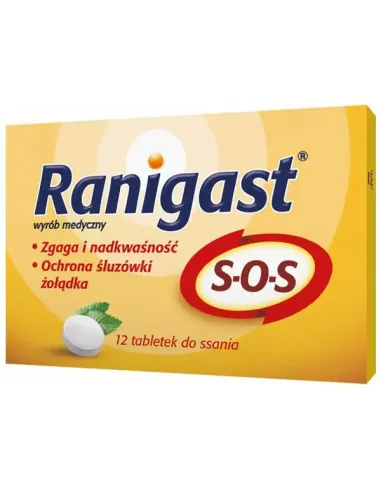 Ranigast SOS to wyrób medyczny w formie tabletek do ssania o smaku cytrynowo-miętowym, dostępny w opakowaniu zawierającym 12 tabletek. Jest przeznaczony do łagodzenia objawów refluksu żołądkowo-przełykowego, takich jak zgaga i ból w nadbrzuszu. Działa poprzez neutralizację kwasoty soku żołądkowego oraz tworzenie ochronnej warstwy na śluzówce żołądka, co zapobiega uczuciu pieczenia i niestrawności.