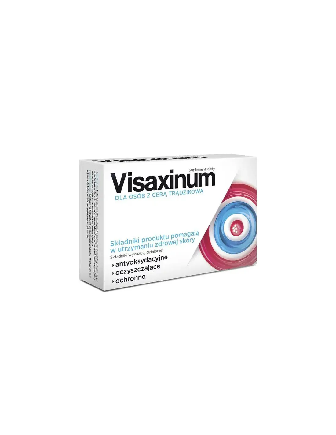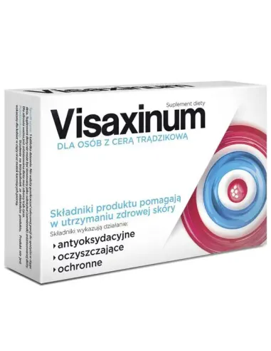 Visaxinum to suplement diety dla osób z cerą trądzikową pomagający w utrzymaniu zdrowej skóry. Zawarte w Visaxinum składniki wspierają działanie oczyszczające, ochronne oraz antyoksydacyjne. Wyciąg z fiołka trójbarwnego wspiera dobry stan skóry, dba od wewnątrz o zdrowie i prawidłowy wygląd skóry. Wyciąg z mniszka lekarskiego wspiera ochronę organizmu przed działaniem wolnych rodników, wspiera także naturalną detoksykację organizmu. Witamina PP pomaga w utrzymaniu prawidłowego stanu błon śluzowych i zdrowej skóry. Cynk pomaga w ochronie komórek przed stresem oksydacyjnym i zachowaniu zdrowej skóry.
