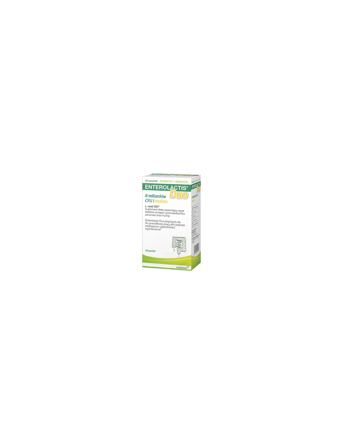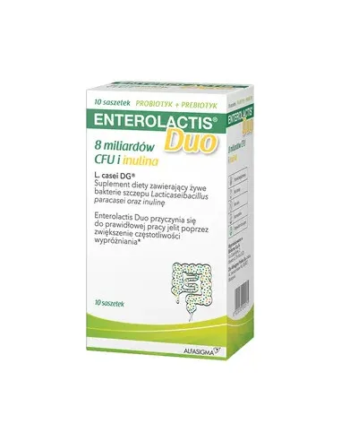 Enterolactis Duo to suplement diety w formie saszetek zawierających żywe kultury bakterii Lacticaseibacillus paracasei DG® (L. casei DG®) oraz inulinę. Produkt wspiera odbudowę i utrzymanie prawidłowej flory bakteryjnej jelit, co jest istotne dla prawidłowego funkcjonowania układu pokarmowego.