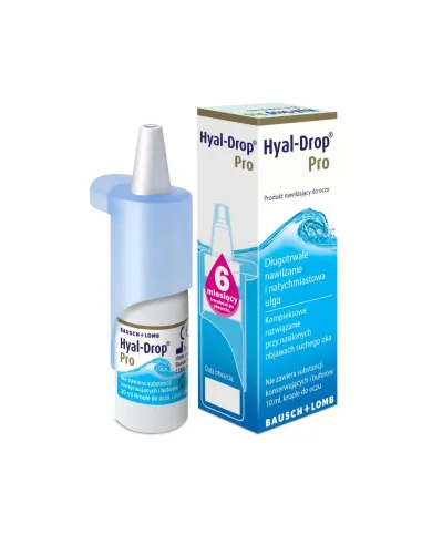 Hyal-Drop Pro krople do oczu to wyrób medyczny. Krople zawierają w swoim składzie naturalną substancję nawilżającą - kwas hialuronowy występujący w płynie łzowym. Roztwór zapewnia długotrwałe nawilżenie rogówki. Dodatkowo glicerol i karbomer zatrzymują wodę w filmie łzowym, a trójglicerydy odbudowują warstwę lipidową filmu łzowego i ograniczają parowanie łez.