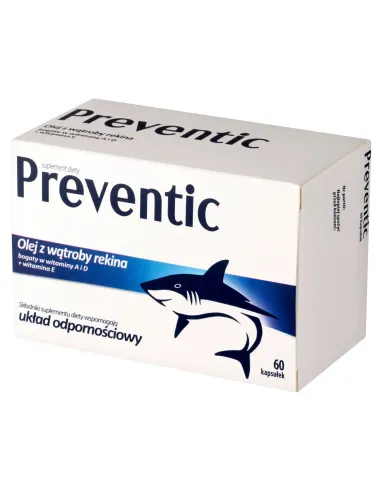 Preventic to suplement diety w postaci kapsułek, zawierający olej z wątroby rekina, bogaty w alkiloglicerole, skwalen oraz witaminę A i D. Formułę dodatkowo wzbogacono o witaminę E. Preparat sprawdzi się jako uzupełnienie codziennej diety osób dorosłych i dzieci po 3 roku życia.