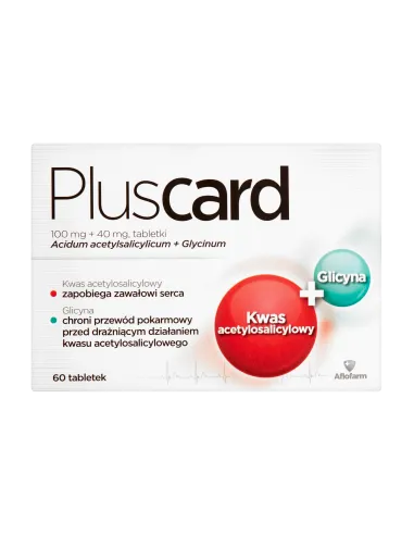 Pluscard to lek zawierający dwie substancje czynne: kwas acetylosalicylowy (100 mg) i glicynę (40 mg). Kwas acetylosalicylowy hamuje agregację (zlepianie się) płytek krwi, co pomaga zapobiegać powstawaniu zakrzepów w naczyniach krwionośnych. Glicyna chroni przewód pokarmowy przed drażniącym działaniem kwasu acetylosalicylowego oraz ułatwia jego wchłanianie.