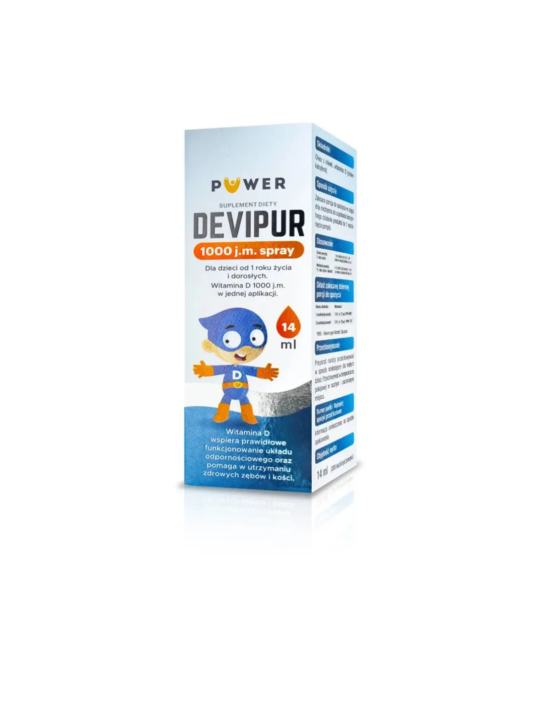 Devipur 1000 to suplement diety w formie wygodnego sprayu, dostarczający witaminę D3 (cholekalcyferol) zawieszoną w oliwie z oliwek. Taka forma podania ułatwia aplikację bezpośrednio do ust i sprzyja efektywnemu wchłanianiu składnika aktywnego. Preparat jest przeznaczony do uzupełniania codziennej diety dzieci powyżej 1. roku życia, młodzieży oraz osób dorosłych, wspierając kluczowe funkcje organizmu zależne od poziomu „witaminy słońca”.