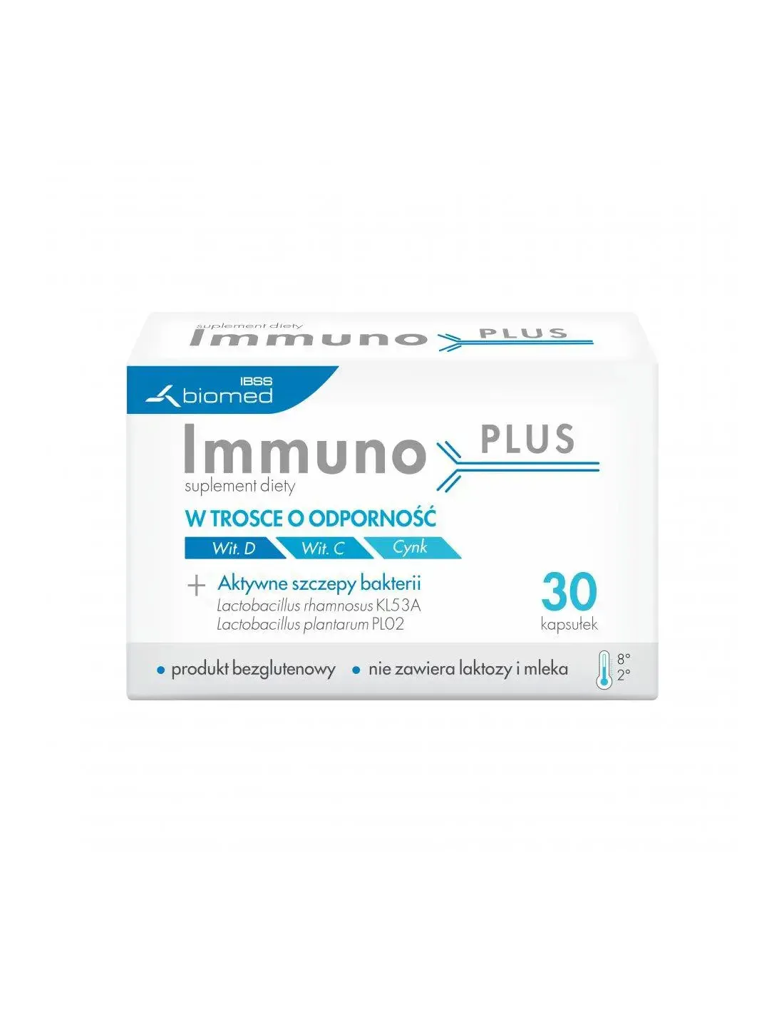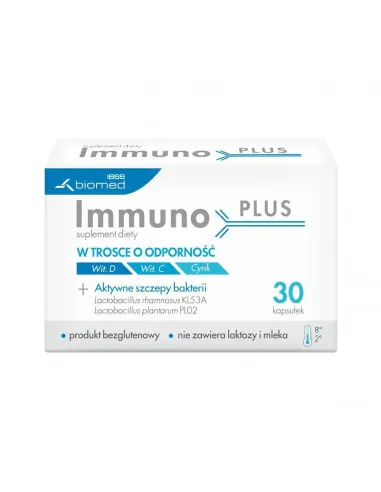Suplement diety Immuno PLUS zawiera dwa polskie, dobrze przebadane, opatentowane szczepy Lactobacillus rhamnosus KL53A i Lactobacillus plantarum PL02 oraz witaminy D i C oraz cynk wspierające układ odpornościowy dzieci i dorosłych.