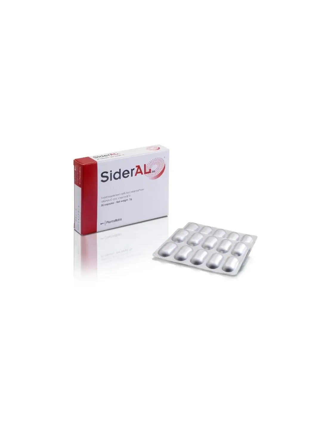 Składniki: żelazo Sideral r.m. - Sucrosomial Iron (pirofosforan żelaza (III), skrobia ryżowa, emulgatory: estry sacharozy i kwasów tłuszczowych, lecytyna słonecznikowa, białka mleka, substancja przeciwzbrylająca: fosforan triwapniowy); żelatyna; witamina C (kwas L-askorbinowy); substancja wypełniająca: celuloza mikrokrystaliczna; substancje przeciwzbrylające: hydroksypropylometyloceluloza, sole magnezowe kwasów tłuszczowych, dwutlenek krzemu; witamina B12 (cyjanokobalamina); barwniki: tlenki i wodorotlenki żelaza, dwutlenek tytanu.