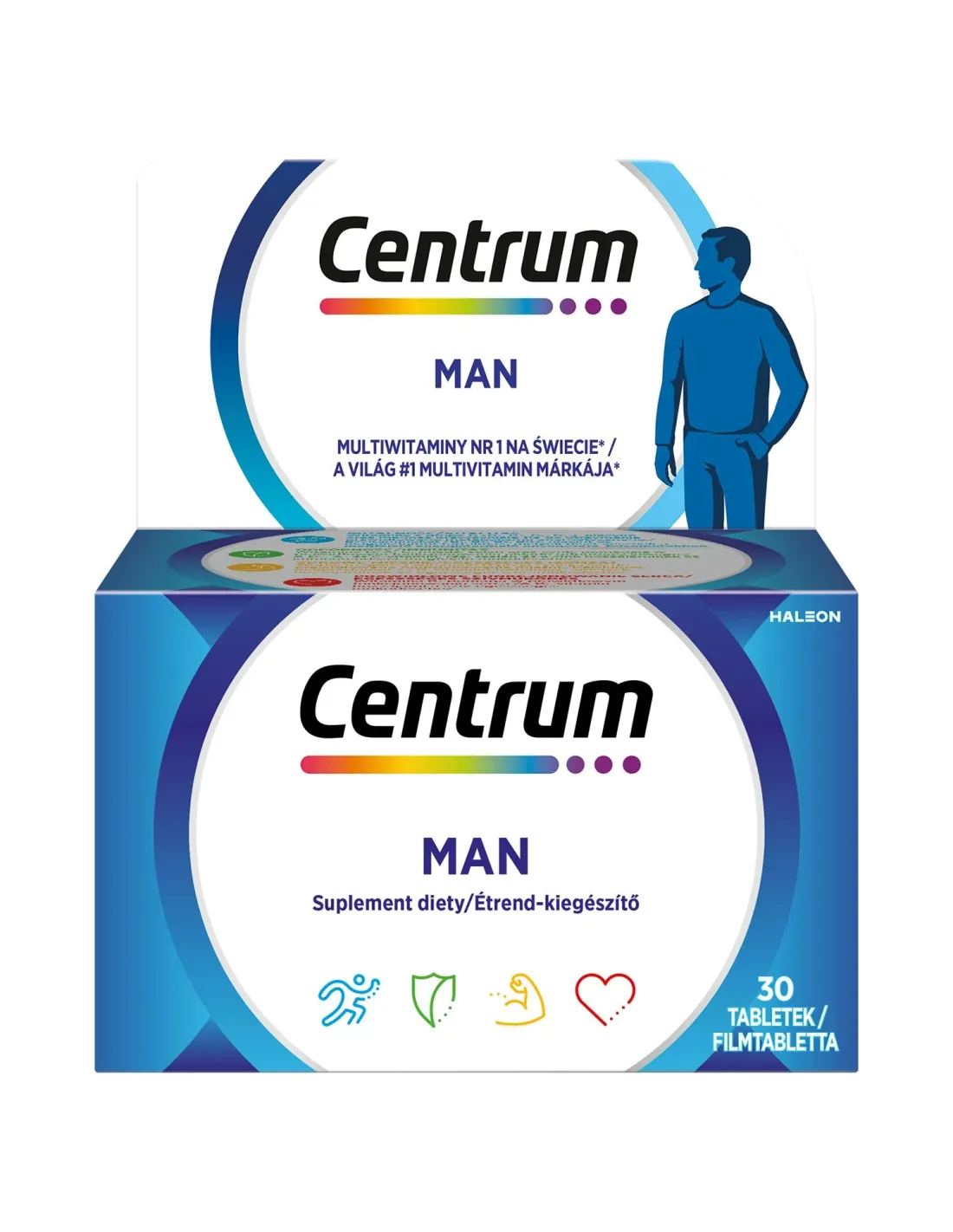Centrum® Man to suplement diety, którego formuła została opracowana w odpowiedzi na potrzeby odżywcze dorosłych mężczyzn. Każda tabletka to połączenie 13 witamin, w tym witamin z grupy B, witamin rozpuszczalnych w tłuszczach: A, D, E, K; witaminy C oraz 10 cennych składników mineralnych, wśród których jest: selen, miedź, cynk i chrom.