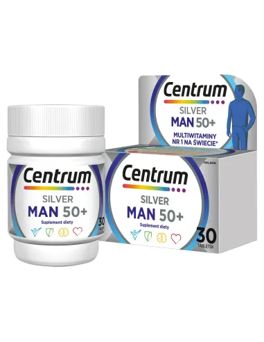 Centrum Man 50+ to suplement diety w postaci tabletek przeznaczony dla mężczyzn po 50 roku życia. W miarę upływu lat zmieniają się nie tylko nawyki żywieniowe, ale także zapotrzebowanie organizmu na pewne składniki odżywcze. Dlatego tak ważne jest ich prawidłowe uzupełnianie. Zawarte w produkcie składniki mineralne i witaminowe dopasowane są do potrzeb odżywczych mężczyzn w średnim wieku i pozwalają na uzupełnienie ich codziennej diety.
