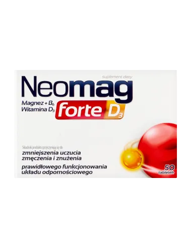 NeoMag Forte D3 to suplement diety zawierający wysoką dawkę magnezu, wzbogacony o witaminy B6 i D3. Produkt przeznaczony jest dla osób dorosłych, które chcą wspierać prawidłowe funkcjonowanie mięśni, układu nerwowego oraz utrzymanie zdrowych kości.