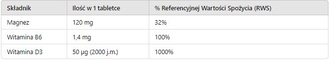 Magnez:Przyczynia się do zmniejszenia uczucia zmęczenia i znużenia, pomaga w utrzymaniu równowagi elektrolitowej, prawidłowym funkcjonowaniu mięśni i układu nerwowego oraz wspiera utrzymanie zdrowych kości i zębów.