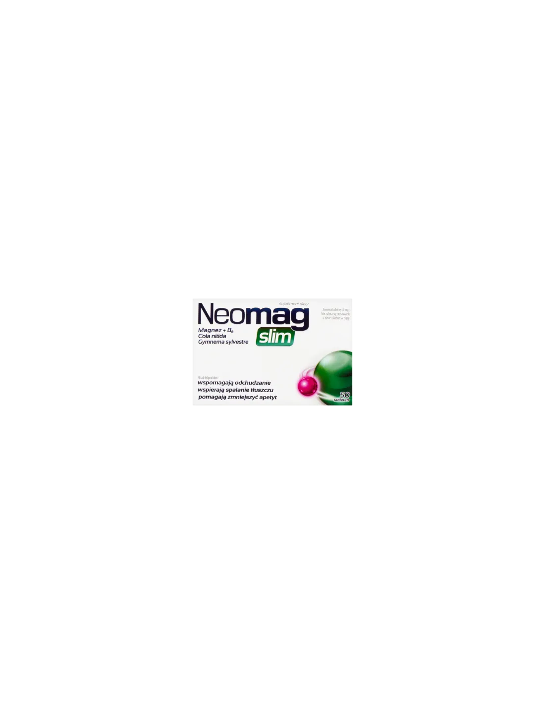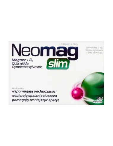 NeoMag Slim to suplement diety przeznaczony dla osób dorosłych, który wspomaga proces odchudzania, spalanie tłuszczu oraz kontrolę apetytu. Preparat zawiera magnez, witaminę B6, wyciąg z nasion koli błyszczącej oraz wyciąg z liści Gymnema sylvestre.