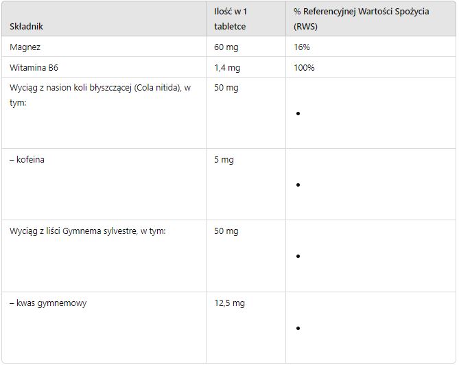 - Wyciąg z liści Gymnema sylvestre – 50 mg, w tym kwas gymnemowy – 12,5 mg