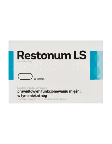 Restonum LS to suplement diety zawierający magnez, żelazo oraz witaminy C, B6 i B12, które wspierają prawidłowe funkcjonowanie mięśni, w tym mięśni nóg, oraz układu nerwowego, zwłaszcza w obrębie kończyn dolnych..