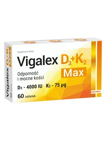 Vigalex D3 + K2 Max to suplement diety w postaci tabletek o wysokiej zawartości dwóch ważnych witamin rozpuszczalnych w tłuszczach: witaminy D i witaminy K. Każda tabletka pozwala na uzupełnienie codziennej diety osób dorosłych w 4000 IU witaminy D oraz 75 µg witaminy K2 MK-7.