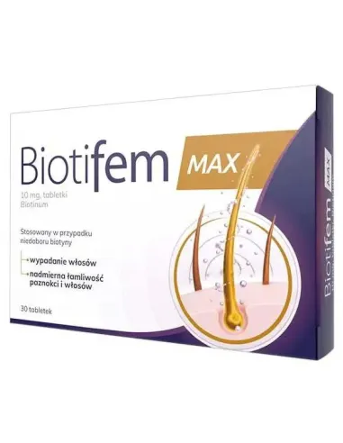 - Substancją czynną Biotifem Max jest biotyna. Każda tabletka zawiera 10 mg biotyny.