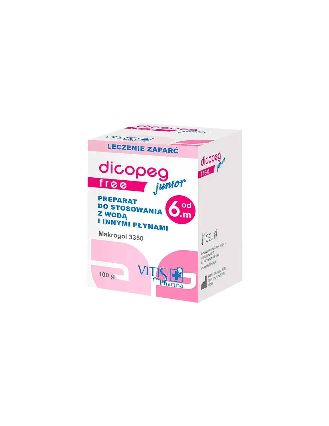 Rozpuścić saszetkę (5 g) w ok. 62,5 ml wody lub innego płynu, takiego jak herbata, mleko, napary ziołowe, rosół lub soki owocowe. Dawkę dzienną można zażywać w kilku podaniach. Można rozpuścić wszystkie saszetki przewidziane na dany dzień w odpowiedniej ilości płynu i wstawić roztwór w zamkniętym pojemniku do lodówki na okres nie dłuższy niż 24 godziny. Zaleca się zażywać DICOPEG JUNIOR FREE w długich odstępach czasu od posiłków.