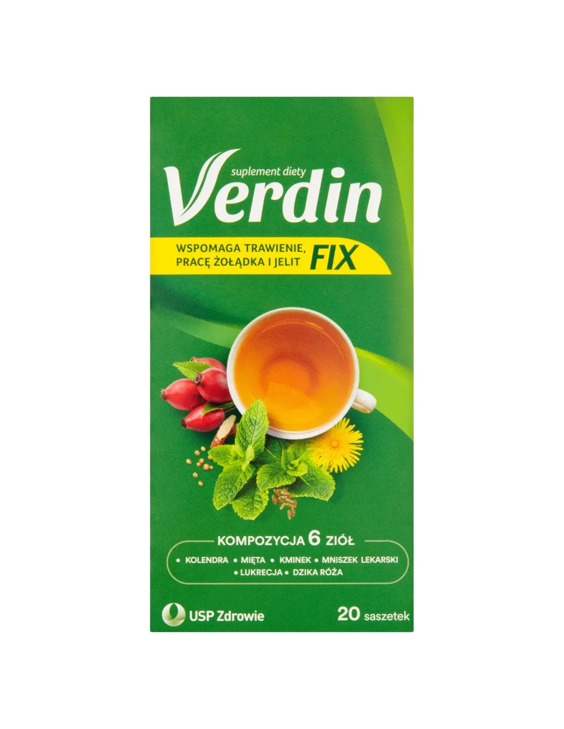 Verdin Fix to suplement diety będący kompozycją sześciu ziół, w tym kolendry, mięty, kminku, mniszka lekarskiego, lukrecji oraz dzikiej róży. Zawarte w produkcie ziele mięty zwyczajnej pomaga utrzymać prawidłowe trawienie poprzez wsparcie właściwego funkcjonowania jelit oraz żołądka. Jednocześnie kolendra siewna pomaga w utrzymaniu prawidłowej równowagi gazowej w przewodzie pokarmowym oraz wspiera zdrowy apetyt. Natomiast kminek zwyczajny przyczynia się do utrzymania właściwego przepływu soków trawiennych. Korzeń lukrecji gładkiej pomaga utrzymać właściwą równowagę oraz komfort trawienny w przewodzie pokarmowy również u osób z wrażliwym układem pokarmowym. Mniszek lekarski jest składnikiem, który wykazuje działanie prebiotyczne i wspiera prawidłowe funkcjonowanie wątroby oraz przyczynia się do utrzymania właściwego pH w żołądku.
