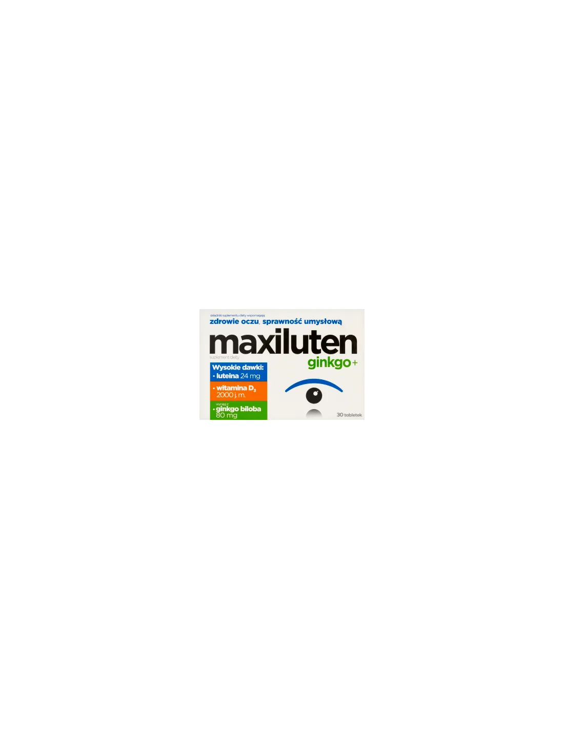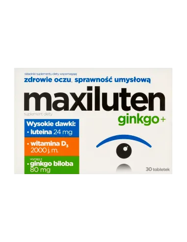 Maxiluten Ginkgo+ to suplement diety w postaci tabletek, który łączy w sobie wysokie dawki luteiny (24 mg), witaminy D3 (2000 j.m.) oraz wyciągu z miłorzębu japońskiego (Ginkgo biloba). Preparat przeznaczony jest dla osób dorosłych, które chcą wspierać zdrowie oczu, pamięć i koncentrację.