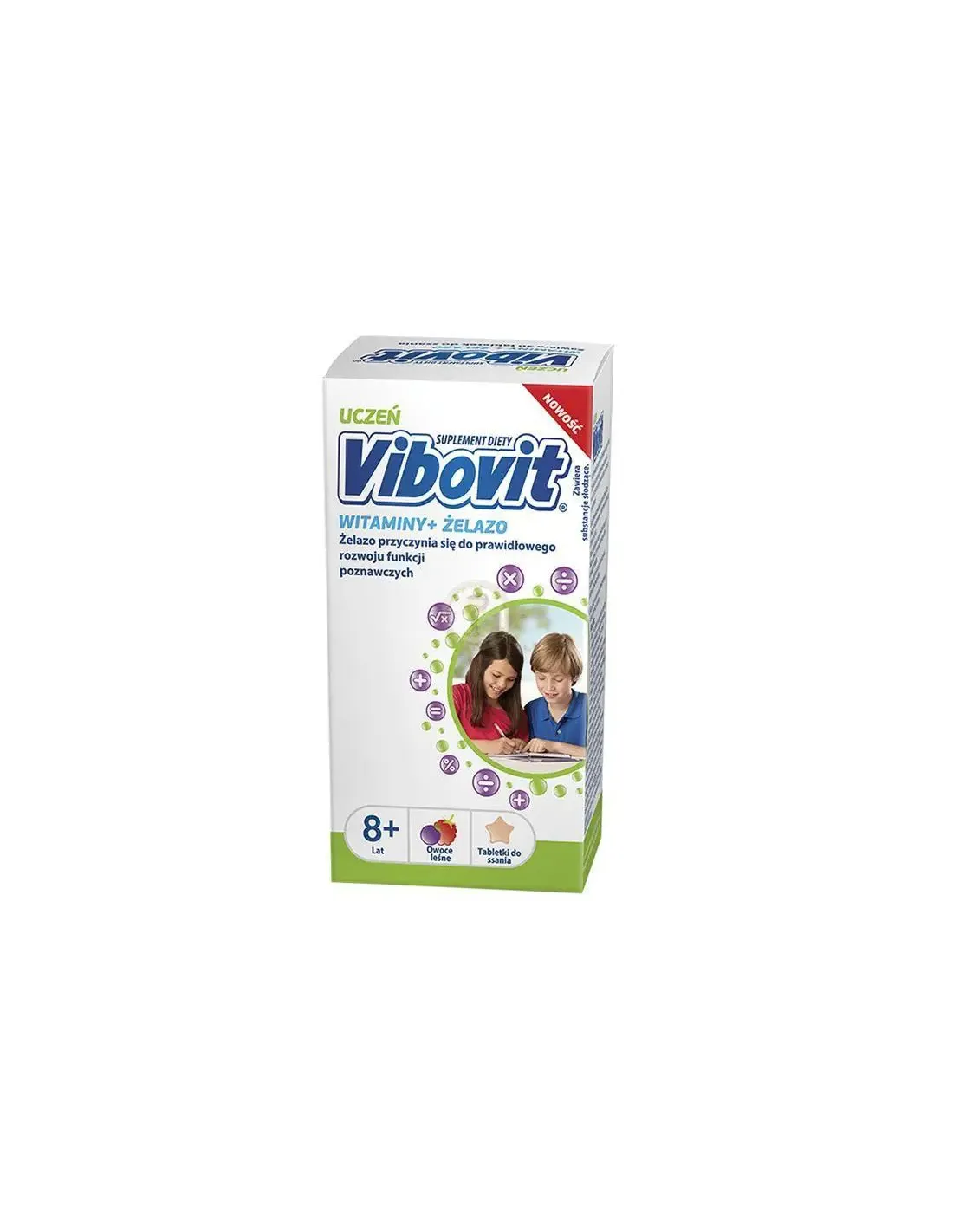 Vibovit® Uczeń Witaminy + Żelazo to tabletki do ssania o zabawnych ksztaltach gwiazdek i smaku owoców leśnych. W każdej tabletce zawiera 17 podstawowych witamin i minerałów w dawce uzupełniającej codzienną dietę i potrzeby dziecka w wieku od 8-12 lat. Zawiera żelazo – składnik mineralny, którego organizm nie umie sam wyprodukować: musi być dostarczony z pożywieniem